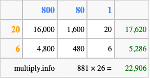 That's all there is to it! As you can see from the box above, the answer to 881 times 26 using the box method is 22,906.