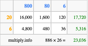 Finally, we add up all the sums we found in step 3 to get our final answer to 886 times 26.