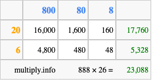 Finally, we add up all the sums we found in step 3 to get our final answer to 888 times 26.