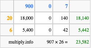 That's all there is to it! As you can see from the box above, the answer to 907 times 26 using the box method is 23,582.