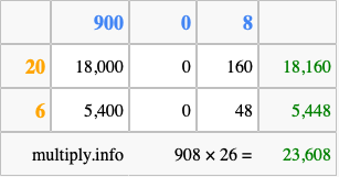 Finally, we add up all the sums we found in step 3 to get our final answer to 908 times 26.