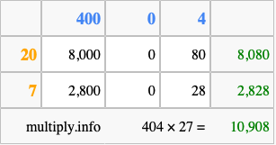 That's all there is to it! As you can see from the box above, the answer to 404 times 27 using the box method is 10,908.