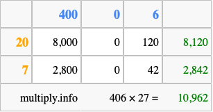 Finally, we add up all the sums we found in step 3 to get our final answer to 406 times 27.