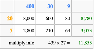 Finally, we add up all the sums we found in step 3 to get our final answer to 439 times 27.