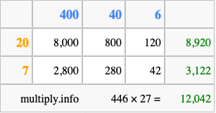 That's all there is to it! As you can see from the box above, the answer to 446 times 27 using the box method is 12,042.