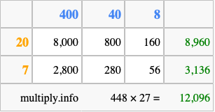 Finally, we add up all the sums we found in step 3 to get our final answer to 448 times 27.