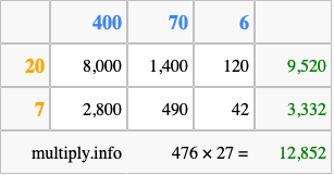 Finally, we add up all the sums we found in step 3 to get our final answer to 476 times 27.