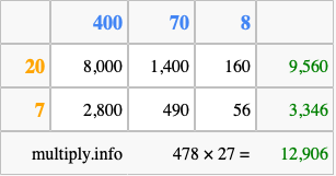 That's all there is to it! As you can see from the box above, the answer to 478 times 27 using the box method is 12,906.