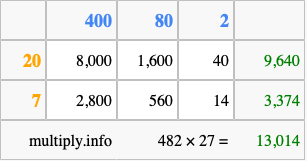 Finally, we add up all the sums we found in step 3 to get our final answer to 482 times 27.