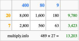 Finally, we add up all the sums we found in step 3 to get our final answer to 489 times 27.