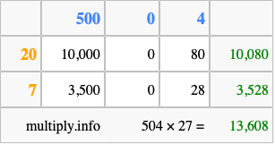 Finally, we add up all the sums we found in step 3 to get our final answer to 504 times 27.