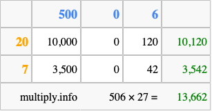 That's all there is to it! As you can see from the box above, the answer to 506 times 27 using the box method is 13,662.
