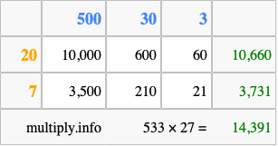 That's all there is to it! As you can see from the box above, the answer to 533 times 27 using the box method is 14,391.