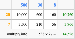 Below is an illustration showing you how to calculate 538 times 27 using the box method, using the instructions above.