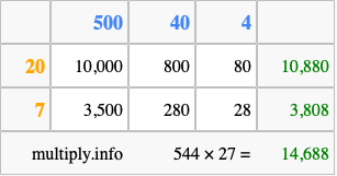 That's all there is to it! As you can see from the box above, the answer to 544 times 27 using the box method is 14,688.