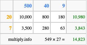 Below is an illustration showing you how to calculate 549 times 27 using the box method, using the instructions above.