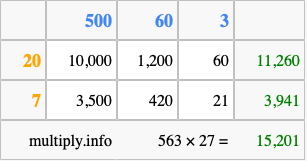 Finally, we add up all the sums we found in step 3 to get our final answer to 563 times 27.