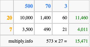 Finally, we add up all the sums we found in step 3 to get our final answer to 573 times 27.