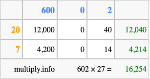 Finally, we add up all the sums we found in step 3 to get our final answer to 602 times 27.