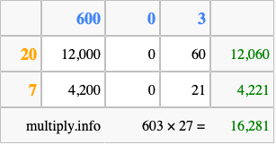 Below is an illustration showing you how to calculate 603 times 27 using the box method, using the instructions above.