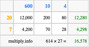 That's all there is to it! As you can see from the box above, the answer to 614 times 27 using the box method is 16,578.