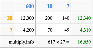 Finally, we add up all the sums we found in step 3 to get our final answer to 617 times 27.