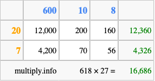 Below is an illustration showing you how to calculate 618 times 27 using the box method, using the instructions above.