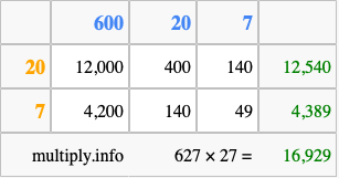 That's all there is to it! As you can see from the box above, the answer to 627 times 27 using the box method is 16,929.