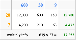 Finally, we add up all the sums we found in step 3 to get our final answer to 639 times 27.