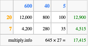 Finally, we add up all the sums we found in step 3 to get our final answer to 645 times 27.
