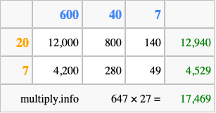 That's all there is to it! As you can see from the box above, the answer to 647 times 27 using the box method is 17,469.