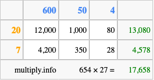 Finally, we add up all the sums we found in step 3 to get our final answer to 654 times 27.