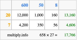 That's all there is to it! As you can see from the box above, the answer to 658 times 27 using the box method is 17,766.