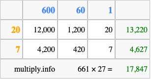 Finally, we add up all the sums we found in step 3 to get our final answer to 661 times 27.