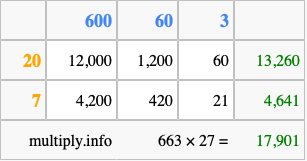 That's all there is to it! As you can see from the box above, the answer to 663 times 27 using the box method is 17,901.