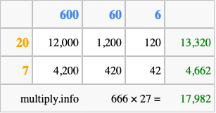 That's all there is to it! As you can see from the box above, the answer to 666 times 27 using the box method is 17,982.