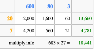Finally, we add up all the sums we found in step 3 to get our final answer to 683 times 27.