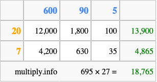 Finally, we add up all the sums we found in step 3 to get our final answer to 695 times 27.