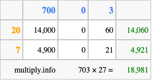 That's all there is to it! As you can see from the box above, the answer to 703 times 27 using the box method is 18,981.