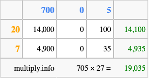 Below is an illustration showing you how to calculate 705 times 27 using the box method, using the instructions above.
