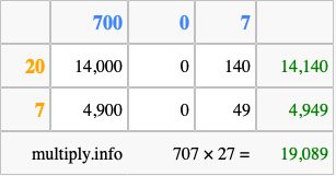Finally, we add up all the sums we found in step 3 to get our final answer to 707 times 27.