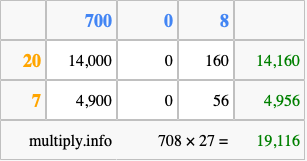 Below is an illustration showing you how to calculate 708 times 27 using the box method, using the instructions above.