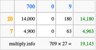 Finally, we add up all the sums we found in step 3 to get our final answer to 709 times 27.