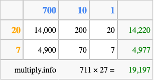 Finally, we add up all the sums we found in step 3 to get our final answer to 711 times 27.