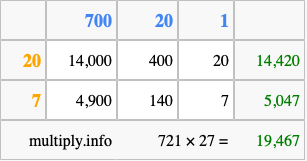 Finally, we add up all the sums we found in step 3 to get our final answer to 721 times 27.