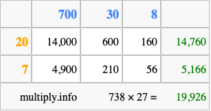 Finally, we add up all the sums we found in step 3 to get our final answer to 738 times 27.