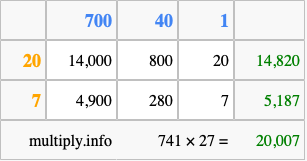 Below is an illustration showing you how to calculate 741 times 27 using the box method, using the instructions above.