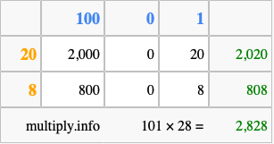 Below is an illustration showing you how to calculate 101 times 28 using the box method, using the instructions above.