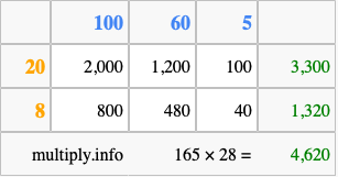 Below is an illustration showing you how to calculate 165 times 28 using the box method, using the instructions above.