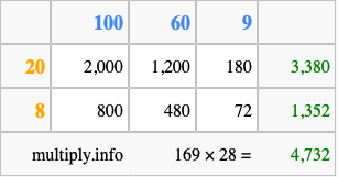 That's all there is to it! As you can see from the box above, the answer to 169 times 28 using the box method is 4,732.